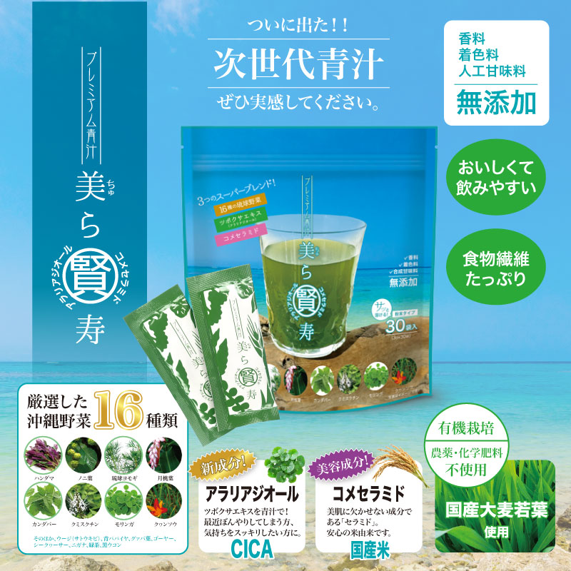 プレミアム青汁の最新作、沖縄の恵みたっぷりの次世代青汁厳選した沖縄野菜を16種類も配合! さらに、CICAでおなじみの「ツボクサエキス」や、 美しい肌に欠かせない国産米由来の「コメセラミド」をオリジナルにブレンド。 とにかく飲みやすさにこだわった、本当に… -